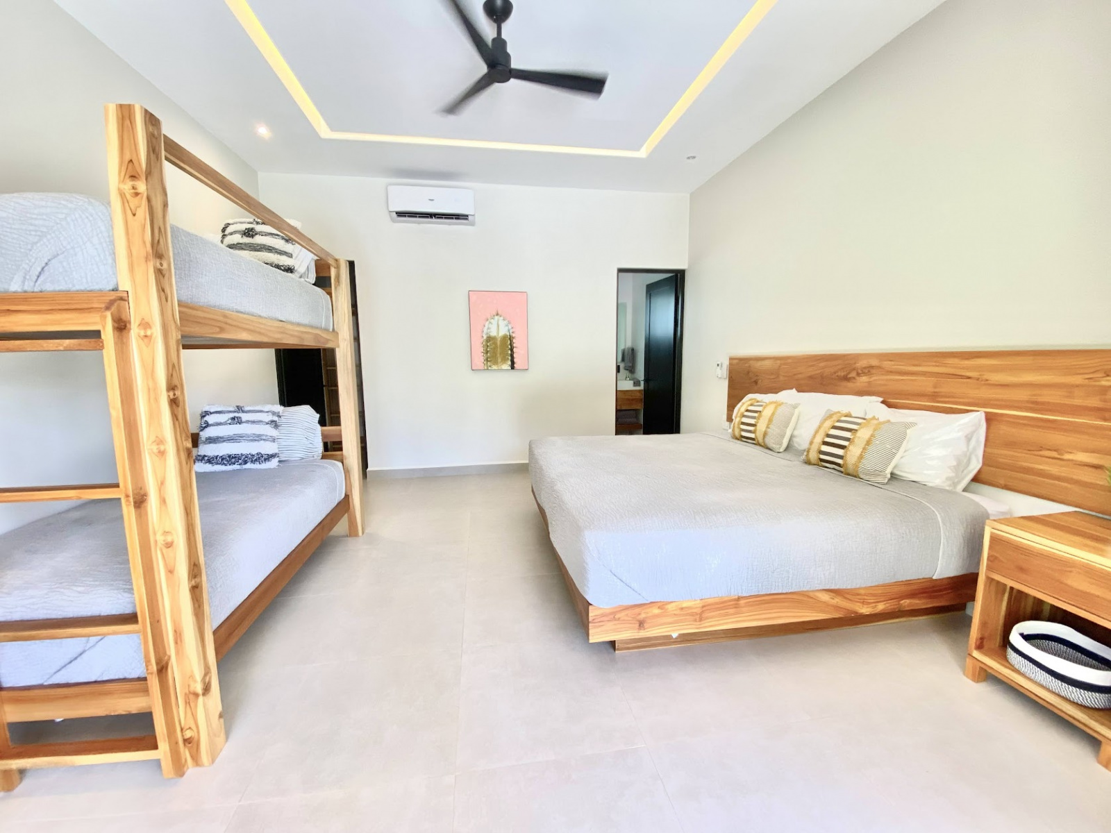 Twin bunk beds + King bed (can convert to 2 twins), ensuite bathroom.